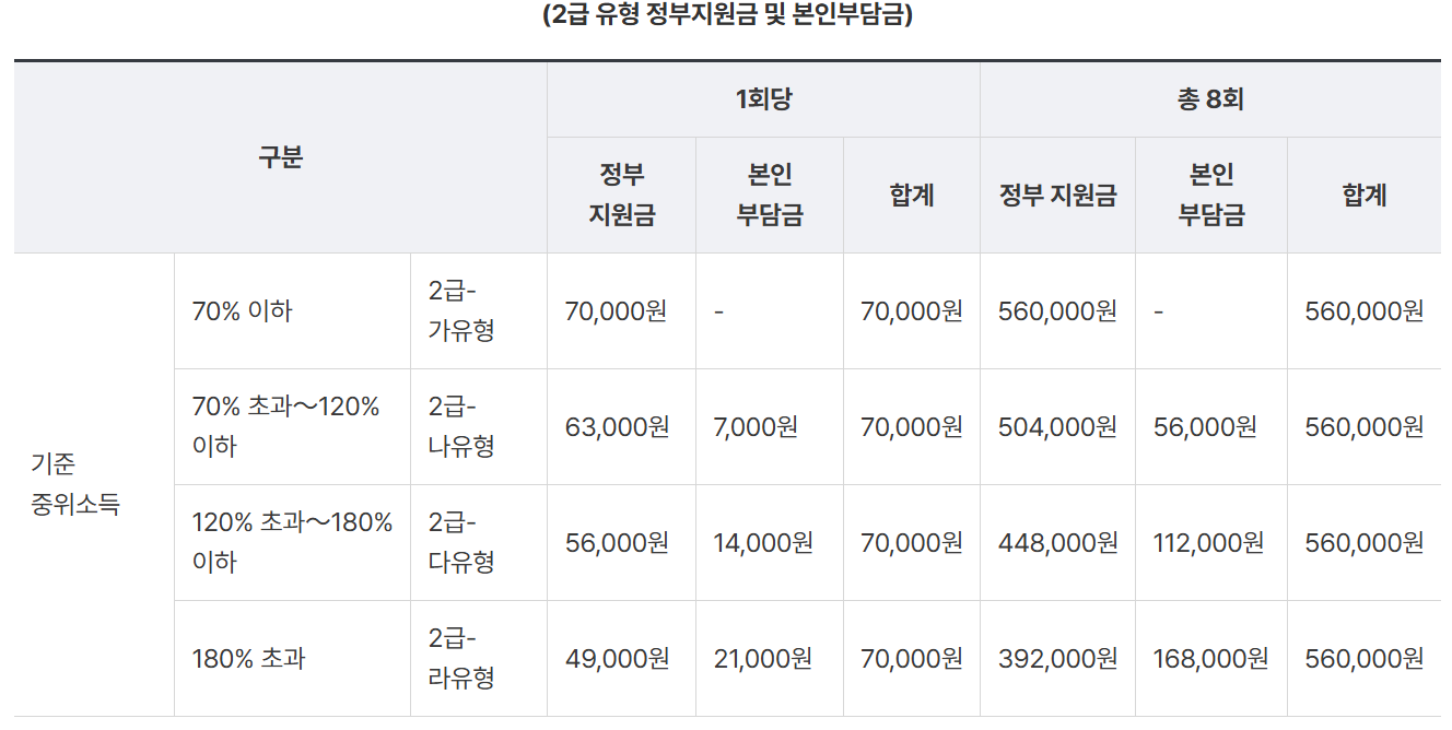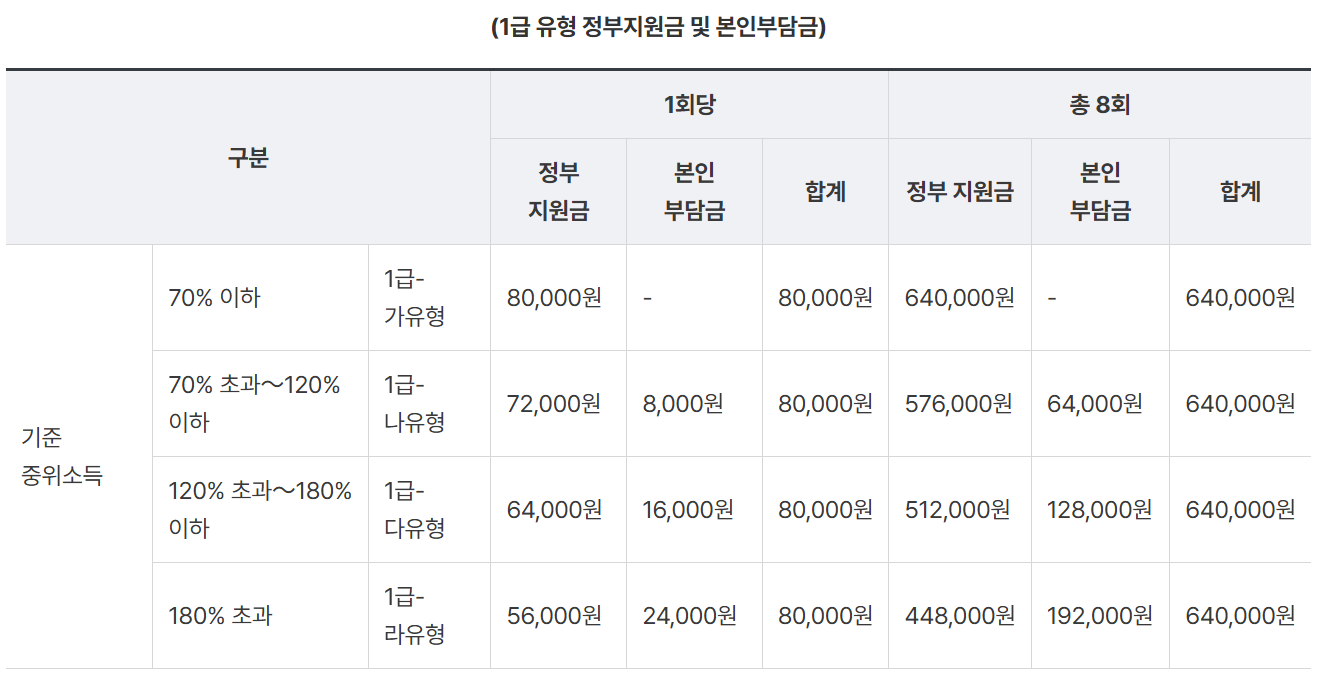 서비스 가격은 1회 기준 1급 유형은 8만 원, 2급 유형은 7만 원이며, 본인 부담금은 소득수준에 따라 차등 부과(0~30%) 됩니다.