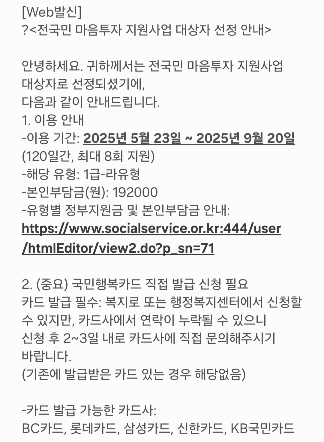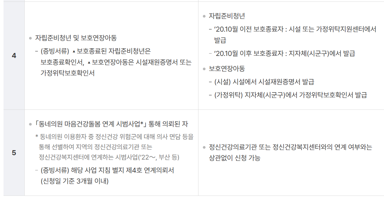 신청방법은 다양하게 있는데 나는 거주지 관할 보건소에 있는 정신건강복지센터에서 의뢰서를 받아서 거주지 관할 행정복지센터에 제출했다. 행정복지센터에서는 서비스 유형을 선택하도록 안내하고, 바우처 카드인 국민행복카드 발급받는 방법을 안내해준다.