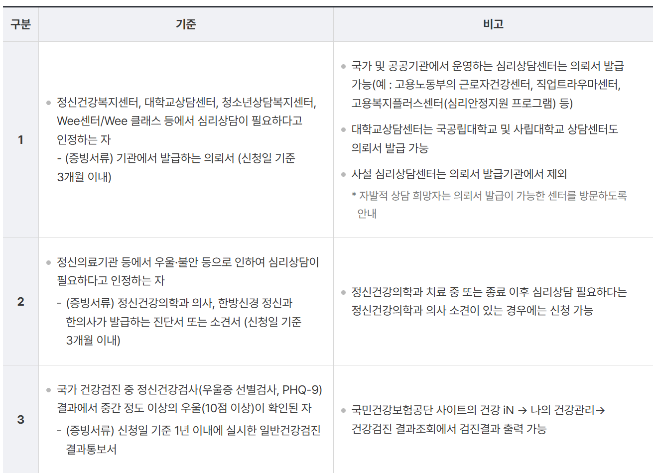 나이 및 소득 기준은 없으며, 우울·불안 등 정서적 어려움이 있는 국민 중 정신건강복지센터, 대학교상담센터, 정신의료기관 등에서 심리 상담이 필요하다고 인정되는 자, 국가건강검진에서 중간 정도 이상의 우울 (우울증 선별검사 10점 이상)이 확인된 자 등이 지원대상자에 해당됩니다.