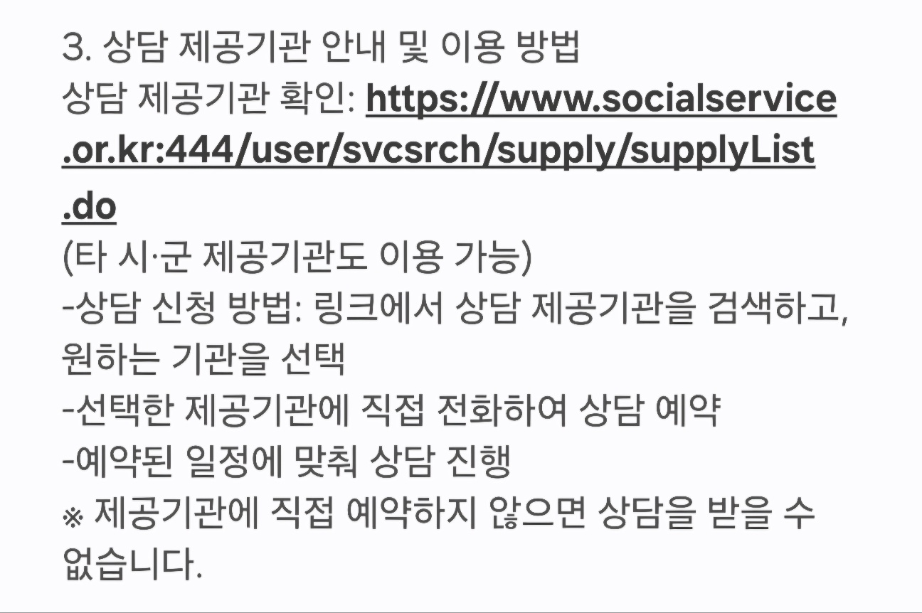 안내문에 나온 방법대로 카드를 신청하고, 2주 정도 기다리니 행정복지센터에서 전국민 마음투자 지원사업 대상자로 결정되었다는 문자가 왔다. 그리고 거주지 관할 시청에서 서비스제공기관 목록을 검색할 수 있는 사이트도 문자로 보내준다. 원하는 제공기관에 연락해서 상담예약을 잡고 방문하면 심리상담을 받을 수 있었다.